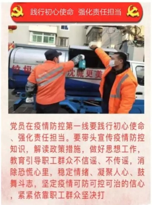 中共中環潔(沈陽)城市環境服務有限公司黨委第一時間發起《致廣大黨員倡議書》,向廣大黨員傳達了黨中央的號召,吹響參加抗疫阻擊戰的集結號,下達了投身抗疫斗爭的動員令。